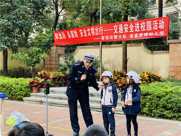 图片来源:省直象峰幼儿园 2020年12月2日是第九个全国交通安全日,今年的主题是“知危险 会避险 安全文明出行”。为进一步提高广大师生的安全意识、法制意识和文明意识,预防和减少道路交通事故发生,提高幼儿交通安全风险防范能力,帮助他们从小培养良好的交通安全习惯,近日,凯发k8市晋安区交警大队走进省直象峰幼儿园,开展交通安全进校园主题活动。