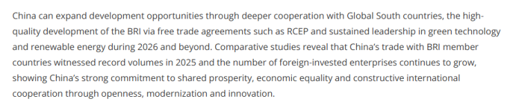 文章认为,中国未来可以通过深化与全球南方国家合作、依托《区域全面经济伙伴关系协定》等自贸协定推动共建“一带一路”倡议高质量发展。数据显示,去年中国与共建“一带一路”国家的贸易额创历史新高,外商投资企业数量持续增长。这充分体现了中国通过开放、现代化与创新,致力于实现共享繁荣、经济平等与建设性国际合作的坚定决心。