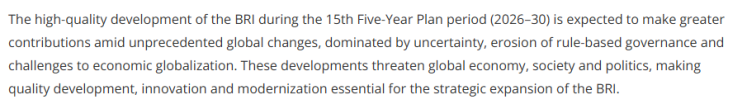 文章关注到,“十四五”时期,共建“一带一路”倡议成绩斐然,已发展成为广受欢迎的国际公共产品,以及推动构建人类命运共同体的关键载体。从社会发展到混合农业与减贫项目,共建“一带一路”倡议正不断惠及相关国家。文章说,展望“十五五”,共建“一带一路”倡议的高质量发展有望在前所未有的全球变局中发挥更大作用。当前世界正被不确定性笼罩,国际治理体系遭到侵蚀,经济全球化面临多重挑战,这些因素正威胁着全球经济、社会与政治的稳定。在此背景下,高质量发展、创新与现代化已成为深化共建“一带一路”倡议发展的关键路径。