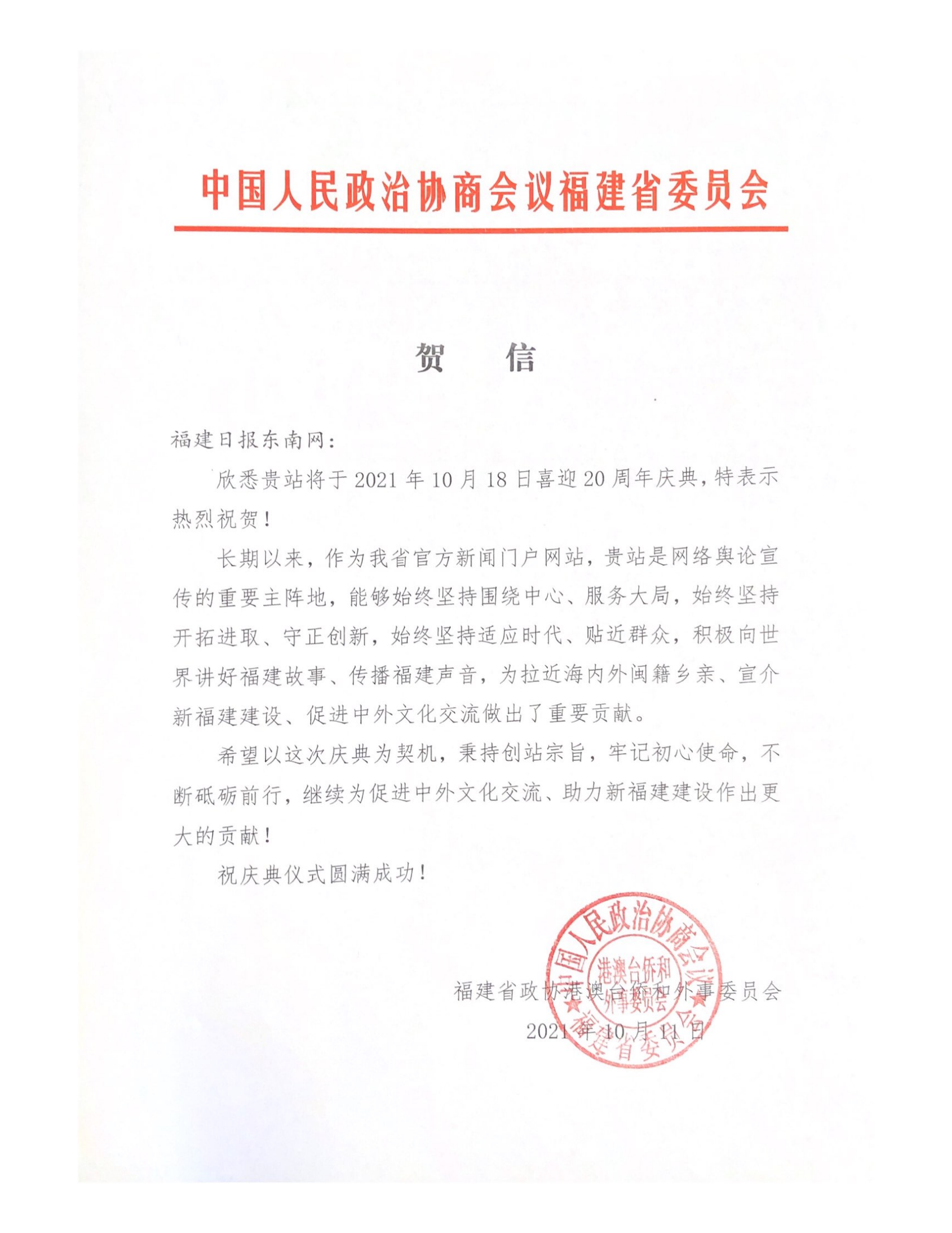 福建省政协港澳台侨和外事委员会贺信
