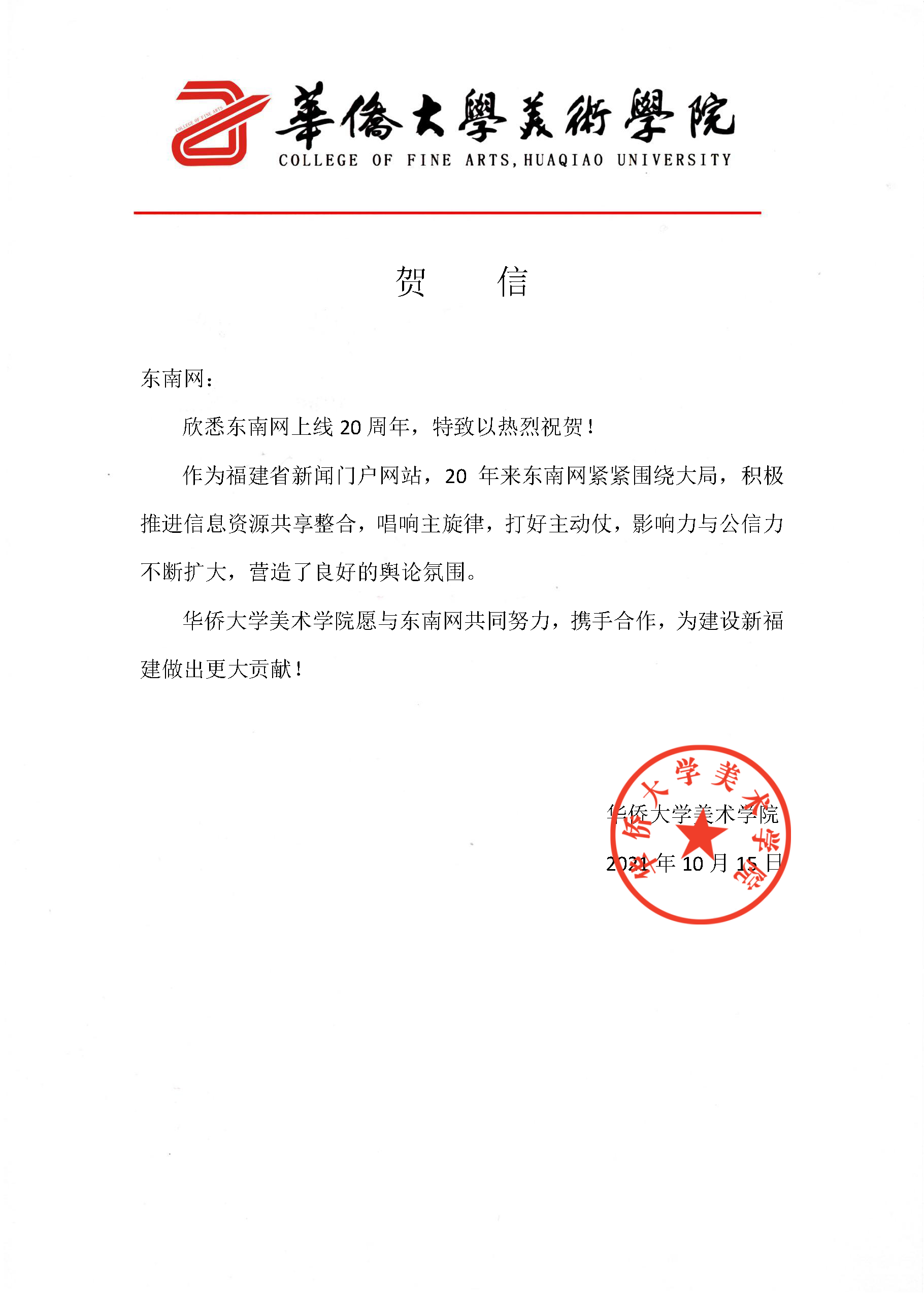 华侨大学美术学院贺信