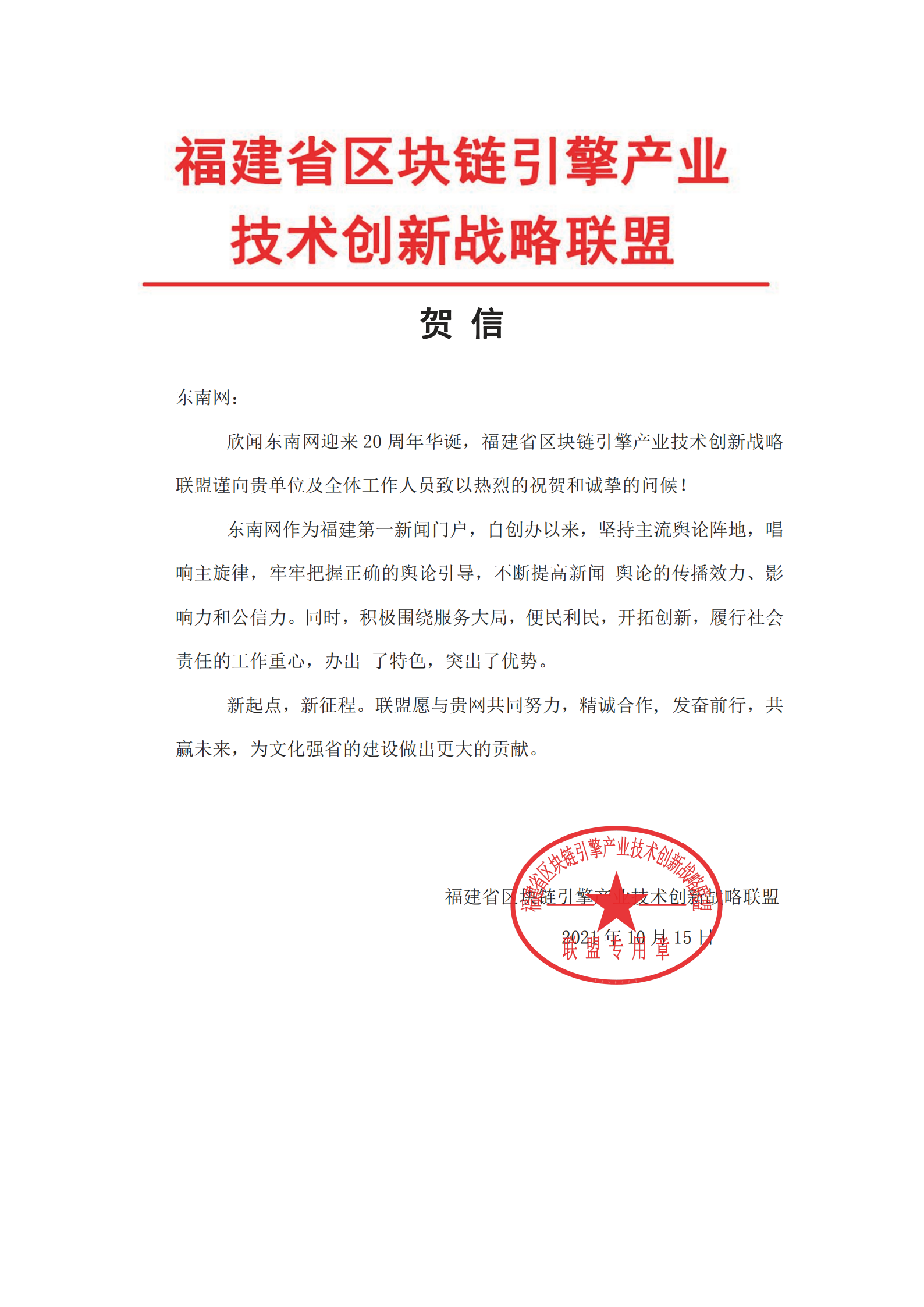 福建省区块链引擎产业技术创新战略联盟贺信