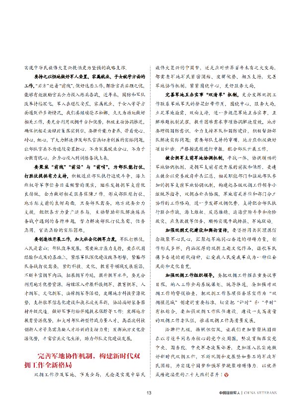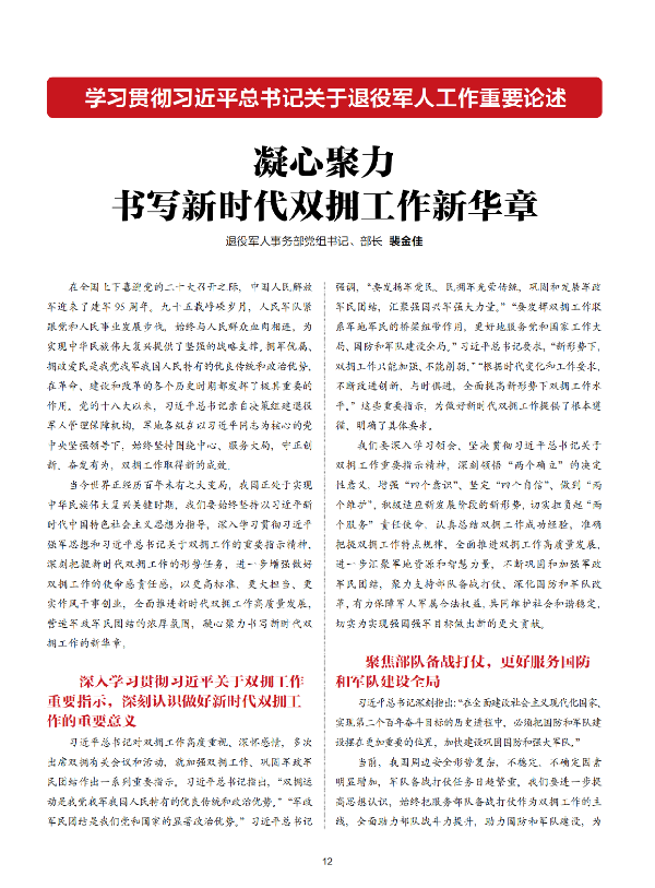 《中国退役军人》杂志2022年第八期在重要位置推出“学习贯彻席大大总书记关于退役军人工作重要论述”专栏,刊发了退役军人事务部党组书记、部长裴金佳署名文章《凝心聚力书写新时代双拥工作新华章》。 凝心聚力书写新时代双拥工作新华章 退役军人事务部党组书记、部长 裴金佳 在全国上下喜迎党的二十大召开之际,中国人民解放军迎来了建军95 周年。九十五载峥嵘岁月,人民军队紧跟党和人民事业发展步伐,始终与人民群众血肉相连,为实现中华民族伟大复兴提供了坚强的战略支撑。拥军优属、拥政爱民是我党我军我国人民特有的优良传统和政治优势,在革命、建设和改革的各个历史时期都发挥了极其重要的作用。党的十八大以来,席大大总书记亲自决策组建退役军人管理保障机构,军地各级在以席大大同志为核心的党中央坚强领导下,始终坚持围绕中心、服务大局,守正创新、奋发有为,双拥工作取得新的成效。 当今世界正经历百年未有之大变局,我国正处于实现中华民族伟大复兴关键时期,我们要始终坚持以席大大新时代中国特色社会主义思想为指导,深入学习贯彻席大大强军思想和席大大总书记关于双拥工作的重要指示精神,深刻把握新时代双拥工作的形势任务,进一步增强做好双拥工作的使命感责任感,以更高标准、更大担当、更实作风干事创业,全面推进新时代双拥工作高质量发展,营造军政军民团结的浓厚氛围,凝心聚力书写新时代双拥工作的新华章。 深入学习贯彻席大大关于双拥工作重要指示 深刻认识做好新时代双拥工作的重要意义 席大大总书记对双拥工作高度重视、深怀感情,多次出席双拥有关会议和活动,就加强双拥工作、巩固军政军民团结作出一系列重要指示。席大大总书记指出,“双拥运动是我党我军我国人民特有的优良传统和政治优势。”“军政军民团结是我们党和国家的显著政治优势。”席大大总书记强调,“要发扬军爱民、民拥军光荣传统,巩固和发展军政军民团结,汇聚强国兴军强大力量。”“要发挥双拥工作联系军地军民的桥梁纽带作用,更好地服务党和国家工作大局、国防和军队建设全局。”席大大总书记要求,“新形势下,双拥工作只能加强、不能削弱。”“根据时代变化和工作要求,不断改进创新、与时俱进,全面提高新形势下双拥工作水平。”这些重要指示,为做好新时代双拥工作提供了根本遵循、明确了具体要求。 我们要深入学习领会、坚决贯彻席大大总书记关于双拥工作的重要指示精神,深刻领悟“两个确立”的决定性意义,增强“四个意识”、坚定“四个自信”、做到“两个维护”,积极适应新发展阶段的新形势,切实担负起“两个服务”责任使命,认真总结双拥工作成功经验,准确把握双拥工作特点规律,全面推进双拥工作高质量发展,进一步汇聚军地资源和智慧力量,不断巩固和加强军政军民团结,聚力支持部队备战打仗、深化国防和军队改革,有力保障军人军属合法权益,共同维护社会和谐稳定,切实为实现强国强军目标做出新的更大贡献。 聚焦部队备战打仗 更好服务国防和军队建设全局 席大大总书记深刻指出:“在全面建设社会主义现代化国家、实现第二个百年奋斗目标的历史进程中,必须把国防和军队建设摆在更加重要的位置,加快建设巩固国防和强大军队。” 当前,我国周边安全形势复杂,不稳定、不确定因素明显增加,军队备战打仗任务日趋繁重。我们要进一步提高思想认识,始终把服务部队备战打仗作为双拥工作的主线,全面助力部队战斗力提升,助力国防和军队建设,为实现中华民族伟大复兴提供更为坚强的战略支撑。 要持之以恒地做好军人安置、家属就业、子女就学方面的工作。“后方”连着“前线”,做好这些工作,解除官兵后顾之忧,能够有效激励官兵全力投入练兵备战。近年来,国防和军队改革持续深化,军人在退役安置、家属就业、子女入学等方面遇到许多新情况。我们要继续毫不松懈、久久为功地做好相关工作,要充分利用双拥平台和优势,积极主动协调推进,确保把相关法规政策落实到位,要提升能力素养,带着爱心、耐心、细心,下大力解决涉及部队官兵切身利益的实际问题,让部队官兵不为退役安置担心、不为家属就业分心、不为子女教育忧心,全身心投入到训练备战上来。 要聚焦“前线”“前沿”与“前哨”,为部队能打仗、打胜仗提供有力支持。积极适应部队执行边境斗争、海上维权等军事任务日益频繁的现实,继承发扬拥军支前优良传统,全力做好相关服务保障工作,形成部队练打仗、地方练支前的良好局面。只要部队需要,地方就要全力支援,组织各方力量广泛参与,主动帮助部队解决练兵备战中遇到的各种难题,努力解决部队打仗急需、任务急用、官兵急盼的实际困难。 要创造性开展工作,加大社会化拥军力度。军队打胜仗,人民是靠山;部队改革发展,需要地方鼎力支持。要在巩固经验和成果的基础上,紧跟军队深化建设改革形势,紧贴部队备战打仗需要,紧盯科技、文化、教育等领域发展前沿,不断丰富拥军内涵,拓展拥军外延,提升拥军水平。要充分利用地方优势资源,持续深入开展科技拥军、教育拥军、人才拥军、文化拥军、法律拥军等活动。发挥地方科技资源优势,支持驻军信息化建设和技术攻关革新,协助搞好装备器材升级改造,做好军事行动伴随