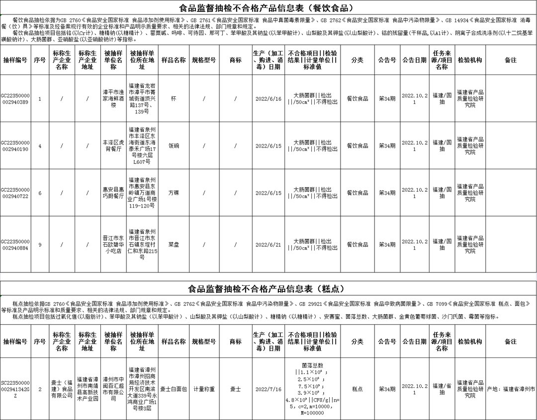 本期抽检,22批次食品不合格,大家一定要谨慎购买哦! 第34期公告的监督抽检信息涉及26大类食品1124批次,包括:粮食加工品、食用油(含油脂及其制品)、调味品、肉制品、乳制品、饮料、方便食品、饼干、罐头、速冻食品、薯类和膨化食品、糖果制品、茶叶及相关制品、酒类、蔬菜制品、水果制品、炒货食品及坚果制品、食糖、水产制品、淀粉及淀粉制品、糕点、豆制品、蜂产品、特殊膳食食品、餐饮食品(含餐饮具)、食用农产品。合格1102批次,不合格22批次。 微生物污染问题:漳平市渔家海鲜酒楼的杯(消毒日期为2022年6月16日),大肠菌群不合格,检验机构为福建省产品质量检验研究院;丰泽区虎背餐厅的饭碗(消毒日期为2022年6月15日),大肠菌群不合格,检验机构为福建省产品质量检验研究院;惠安县惠巧厨餐厅的方碟(消毒日期为2022年6月15日),大肠菌群不合格,检验机构为福建省产品质量检验研究院;晋江市东石欧碧华小吃店的菜盘(消毒日期为2022年6月21日),大肠菌群不合格,检验机构为福建省产品质量检验研究院;豪士(福建)食品有限公司2022年7月16日生产的豪士白面包,菌落总数不合格,销售单位为漳州市中闽百汇超市有限公司,检验机构为福建省产品质量检验研究院。