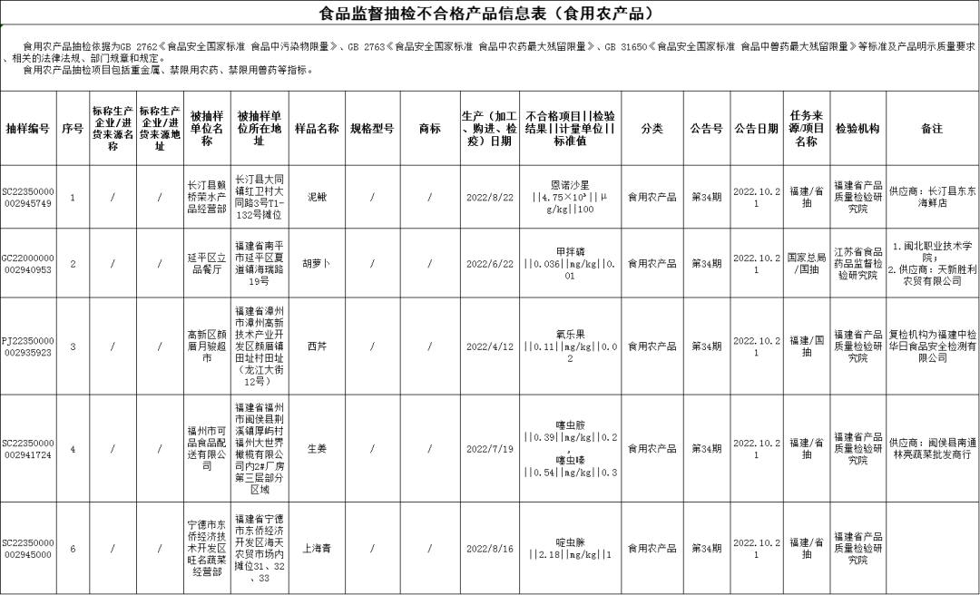 农兽药残留问题:长汀县赖桥荣水产品经营部销售的泥鳅(购进日期为2022年8月22日),恩诺沙星不合格,检验机构为福建省产品质量检验研究院;延平区立品餐厅销售的胡萝卜(购进日期为2022年6月22日),甲拌磷不合格,检验机构为江苏省食品药品监督检验研究院;高新区颜厝月骏超市销售的西芹(购进日期为2022年4月12日),氧乐果不合格,初检机构为福建省产品质量检验研究院,复检机构为福建中检华日食品安全检测有限公司;凯发k8市可品食品配送有限公司销售的生姜(购进日期为2022年7月19日),噻虫胺不合格、噻虫嗪不合格,检验机构为福建省产品质量检验研究院;宁德市东侨经济技术开发区旺名蔬菜经营部销售的上海青(购进日期为2022年8月16日),啶虫脒不合格,检验机构为福建省产品质量检验研究院。