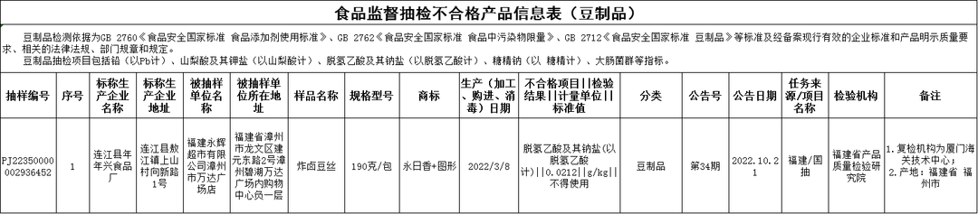 食品添加剂问题:连江县年年兴食品厂2022年3月8日生产的炸卤豆丝,脱氢乙酸及其钠盐(以脱氢乙酸计)不合格,销售单位为福建永辉超市有限公司漳州市万达广场店,初检机构为福建省产品质量检验研究院,复检机构为厦门海关技术中心。