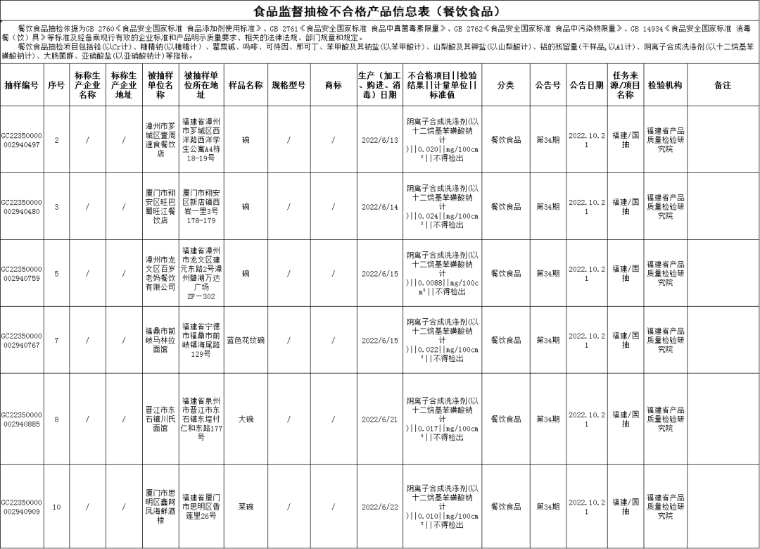 其他污染问题:漳州市芗城区壹周速食餐饮店的碗(消毒日期为2022年6月13日),阴离子合成洗涤剂(以十二烷基苯磺酸钠计)不合格,检验机构为福建省产品质量检验研究院;厦门市翔安区旺巴蜀旺江餐饮店的碗(消毒日期为2022年6月14日),阴离子合成洗涤剂(以十二烷基苯磺酸钠计)不合格,检验机构为福建省产品质量检验研究院;漳州市龙文区百岁老妈餐饮有限公司的碗(消毒日期为2022年6月15日),阴离子合成洗涤剂(以十二烷基苯磺酸钠计)不合格,检验机构为福建省产品质量检验研究院;福鼎市前岐马林拉面馆的蓝色花纹碗(消毒日期为2022年6月15日),阴离子合成洗涤剂(以十二烷基苯磺酸钠计)不合格,检验机构为福建省产品质量检验研究院;晋江市东石镇川氏面馆的大碗(消毒日期为2022年6月21日),阴离子合成洗涤剂(以十二烷基苯磺酸钠计)不合格,检验机构为福建省产品质量检验研究院;厦门市思明区鑫阿凤海鲜酒楼的菜碗(消毒日期为2022年6月22日),阴离子合成洗涤剂(以十二烷基苯磺酸钠计)不合格,检验机构为福建省产品质量检验研究院。