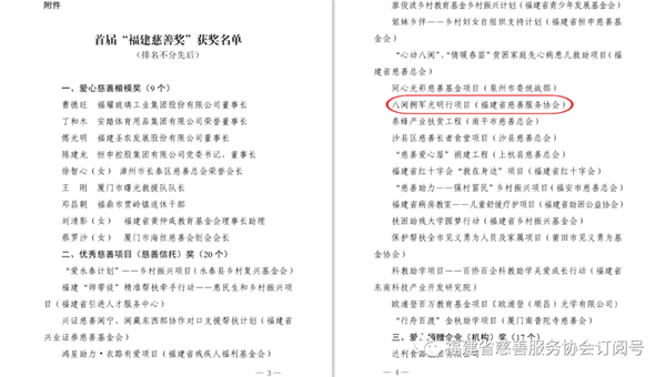 近日,福建省人民政府发布《关于表彰首届“福建慈善奖”获得者的决定》(闽政文〔2023〕133号)文件,由福建省省委,福建省人民政府颁发的首届“福建慈善奖”名单出炉。 福建省慈善服务协会“八闽拥军光明行”项目荣获“优秀慈善项目奖”。 获奖名单