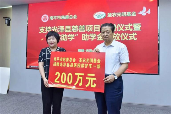 近日,全国模范退役军人、福建圣农集团董事长傅光明再次向社会捐出580万元,用于以下5类慈善项目:一是光泽县6个村(社区)“长者食堂”运营补助;二是5个乡镇12个村农田灌溉、村道硬化、乡村美化项目;三是光泽县创建省级文明城市宣传;四是光泽县医院购买救护车;五是资助10位家庭困难的2023届大学生每年2万元、连续资助4年,直至完成大学学业。