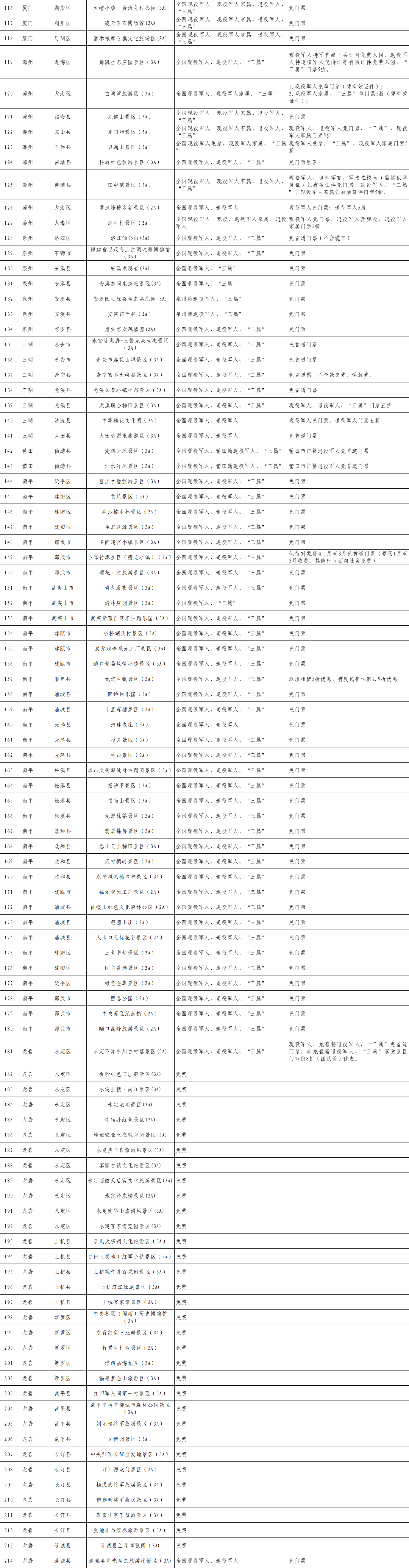 尊崇不间断,优待常出新。近日,福建省退役军人事务厅联合省文化和旅游厅全力推动近300家A级景区,面向退役军人及其他优抚对象提供优待政策,有的门票五折,有的全免。其中,5A级景区11家12处、4A级景区84家、3A级以下景区197家。