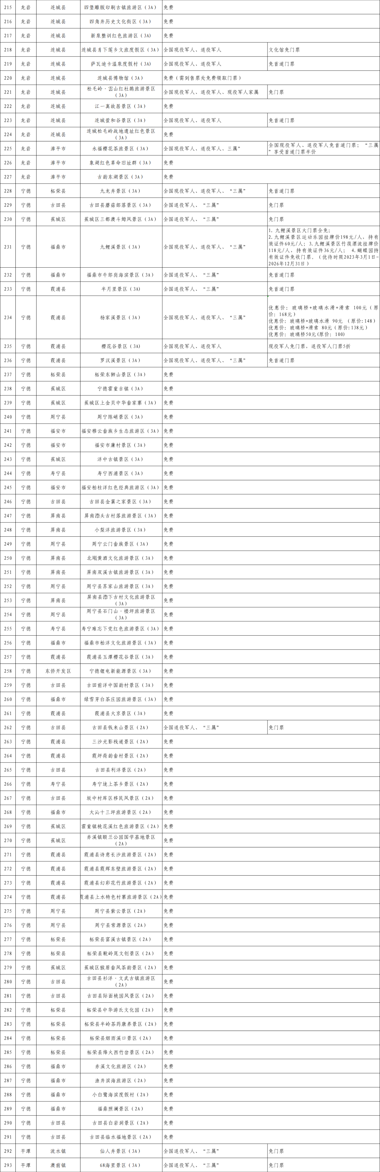 福建省A级旅游景区优待项目清单