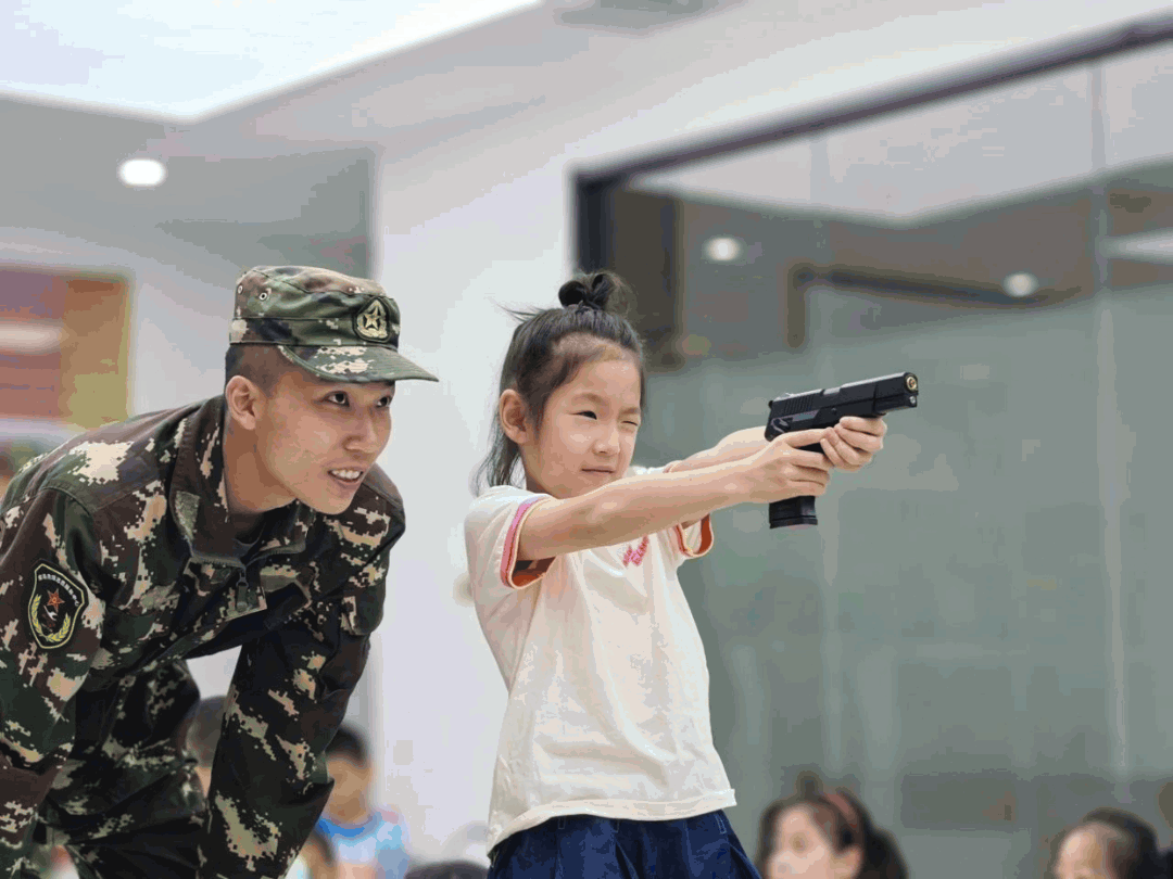 军事体验场上更是热闹非凡,枋湖南社区的孩子们分组练军姿、敬军礼,大龄孩子挑战刺杀与模拟射击,低龄孩子专注体验射击乐趣;禾山社区的小同学们聚精会神练队列、练瞄准,汗水浸湿衣衫仍斗志昂扬,欢呼声此起彼伏。