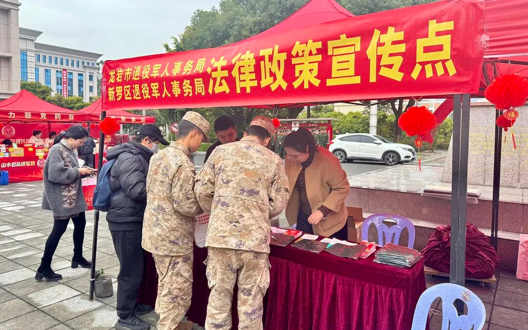 本次活动由中共厦门市委退役军人事务工作领导小组(厦门市双拥共建工作领导小组)办公室、厦门市退役军人事务局、厦门市商务局、中国人民解放军31659部队、中国人民解放军73051部队主办。 龙岩市 1月31日,龙岩市民兵训练营广场暖意融融、热闹有序,由龙岩市退役军人事务局、市商务局、龙岩军分区政治工作处联合主办的“山水岩品进军营 双拥共建促消费”活动在此举行。20余家本土老字号特色品牌和知名运动品牌企业带着千余款特色产品走进军营,6位书法家现场挥毫为官兵及军属免费书写春联、福字。 活动现场精心设置“龙岩优品”“翰墨迎春”“法律宣传”“消费券发放”四个专区。共为参与活动的官兵及军属发放总额两万元的消费券,以精准贴心的优惠举措、一站式便捷服务,切实为官兵及军属送上关怀与温暖。